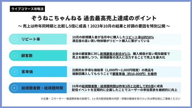 ライブコマース事業を展開する株式会社Cellest(本社:大阪府大阪市、代表取締役社長:佐々木 宏志、以下当社)は、当社が運営する国内トップクラスの販売実績を誇るライブコマース販売事業「ぞうねこちゃんねる」において、2023年10月の売上が過去最高の単月2,500万円を突破したことをお知らせします。ライブコマース業界の活性化及び更なる市場の発展を目的とし、ライブコマースにおける売上好調の秘訣を特別に公開いたします。