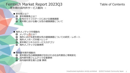 一般社団法人Femtech Community Japan(東京都渋谷区、代表理事 皆川朋子、以下Femtech Community Japan)は、レポート「Femtech Market Report_2023Q3 - 更年期の国内外サービス動向 - 」をリリースしたことをお知らせします。なお、レポート配布につきましては、会員企業様限定の方針とさせていただいております。ご希望ございましたら個別ご相談ください。