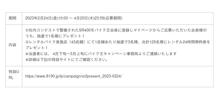昨年実施の社内コンテストへ出展されたSR400を、バイク王会員に登録しマイページからご応募いただいた方の中から抽選で1名様にプレゼントいたします。