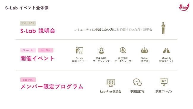 S-Labでは、下記のような様々なイベント、活動を起点として運営を行っていきます。