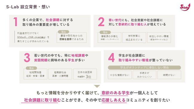 S-Labとは「未来への架け橋を S-Labで社会への扉を開き社会問題に一緒に取り組もう!」をテーマに、学生主体で共に成長できるコミュニティです。S-Lab内のイベントや活動を通じて、社会課題に関心を持った学生たちが主体的に活動できる環境を創り出し、 情報を共有、アイデアを交換しながら、社会への貢献をしていくコミュニティです。 全国の大学生が連携し、プロジェクトを立ち上げ、地域や社会にポジティブな影響を与えることを目指していきます。