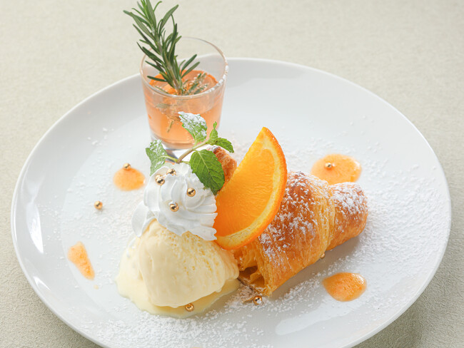 『黄金のクロワッサン』にバニラアイスとホイップをトッピング。仕上げに爽やかなシャンドン ガーデン スプリッツシロップを掛けたデザートです。