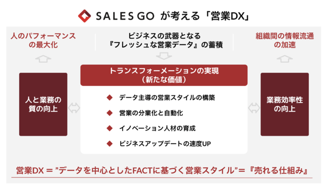 データとインサイドセールスを活用し売れる仕組みを作る会社、SALES GO株式会社(セールスゴー/所在地:東京都品川区/代表取締役社長:内山 雄輝/以下SALES GO)は、SALES GOの考える「営業DX」の定義およびコーポレートアイデンティティ(企業理念)を策定し、11月28日にコーポレートサイトをリニューアル公開しました。