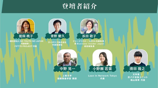 話題の『「男性中心企業の終焉』」を昨年出版されたジャーナリストの浜田敬子さんや、YouTubeで『男性のためのフェミニズム入門』シリーズを始めた上智大学教授の中野晃一先生、企業経営の視点からジェンダー問題にも鋭く切り込むサイボウズ社長の青野慶久さん、若い力を政治に反映すべく活動されている能條桃子さん、女性のエンパワメントに取り組むリーンイン東京 Lean In Tokyo新代表の小野瀬若葉さん、恋愛相談を通じてジェンダーの問題を浮き彫りにしている男性のホモソシアルを自身の経験から本にもされている清田隆之さんをお迎えしました。