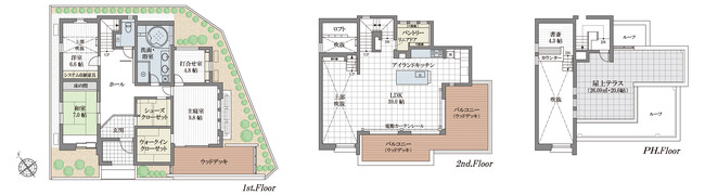 1階床面積:110.10平方メートル (33.30坪)/2階床面積:85.22平方メートル (25.77坪)/PH階床面積:7.45平方メートル (2.25坪)