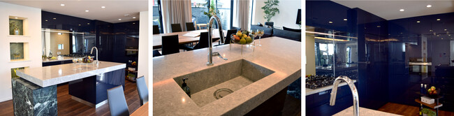 ヴィラのような開放感溢れるアイランドキッチンはフルオーダーです。冷蔵庫・オーブン・カップボードを全てビルトインし、生活感が少ないすっきりとした印象です。シンク周りに大理石を使用し、高級感のあるキッチンに仕上げました。
