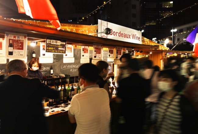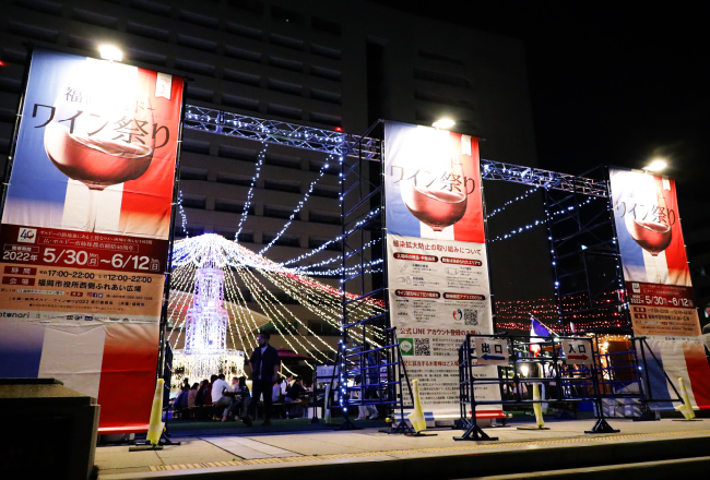 過去開催実績 ・福岡ボルドーワイン祭り2017 会場 福岡市役所・九州広場 日程 2017.10/7(土)~10/9(日)の3日間 時間 平日12:00~21:00 ・福岡ボルドーワイン祭り2018 会場 福岡市役所西側ふれあい広場・九州広場 日程 2018. 10/5(金)~14(日)の10日間 時間 平日17:00~22:00 土日祝日12:00~22:00 ・福岡ボルドーワイン祭り 2019 SPRING 会場 福岡市役所西側ふれあい広場 日程 2019.4/17(水)~4/28(日)の12日間 時間 平日17:00~22:00 土日祝日12:00~22:00 ・福岡ボルドーワイン祭り 2019 AUTUMN 会場 福岡市役所前・九州広場 日程 2019.9/27(金)~10/6(日)の10日間 時間 平日16:00~22:00 土日祝日12:00~22:00 ・福岡ボルドーワイン祭り2022 会場 福岡市役所西側ふれあい広場 日程 2022.5/30(水)~6/12(日)の14日間 時間 平日17:00~22:00 土日祝日12:00~22:00 来場者数 おおよそ55,000人
