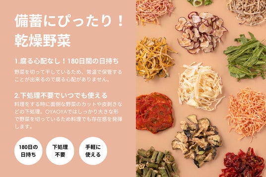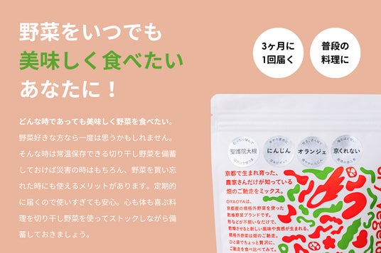 OYAOYAでは、「おいしい!を耕そう。」をテーマとして、京都産の規格外野菜をアップサイクルした乾燥野菜を2021年より販売しています。野菜は天日干しに近い温度でじっくり乾かすことにより、旨味や栄養が凝縮するのはもちろん、生鮮野菜では気付けなかった、野菜の隠れた魅力を引き出すことも可能になります。本商品は、保存や備蓄だけでなく、普段の食事シーンでも使えるのでローリングストックとして保管し、いつでも美味しい野菜を食べることができます。
