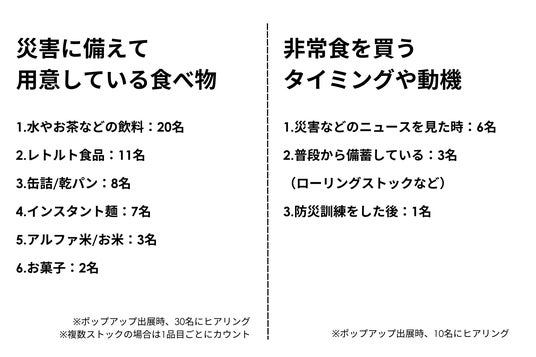 もしもの時のために備蓄している非常食や購入するタイミングを自社調べで調査しました。また、現状を踏まえて今後意識したいこともヒアリングを行いました。