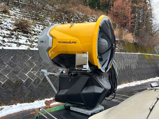 人工降雪機は、圧縮した空気と水を混ぜ、一気に噴霧する仕組みです。 この霧状の水が、大気で冷却され人工雪となります。従来の降雪機は気温が氷点下以下にならないと使用することができないため、使用されるのは気温が下がる夜間がメインでしたが、最新機器では湿度や水温など総合的に判断しプラス温度でも稼働ができるため、気温があがる日中でも運用が可能です。 これらの降雪機は長野オリンピックのゲレンデ造りでも使用されました。