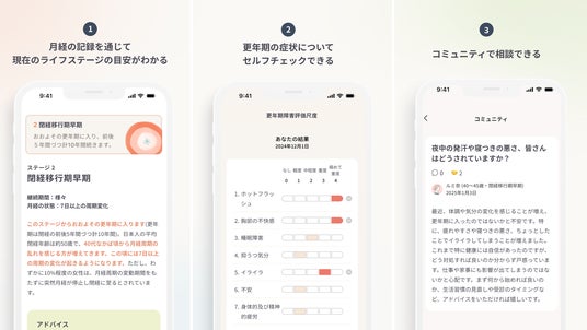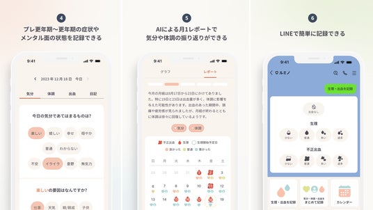 「Lumino」は、プレ更年期~更年期世代のための月経・体調管理アプリです。更年期医療の専門医が監修し、医学的知見に基づいたアドバイスを提供。月経記録をもとにライフステージの目安を判断し、心身の状態や変化を可視化するとともに、AIを使って個別のヘルスケアレポートを提供。さらに、簡単にできるセルフチェック機能を搭載し、不調の気づきや対策をサポートします。