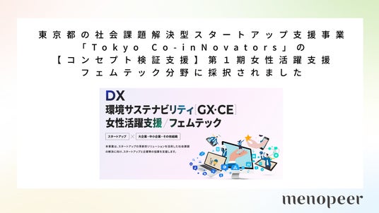 「女性の心身の健康支援を通じて、自己実現を目指し続けられる社会の実現」をミッションに掲げ、更年期世代向けヘルスケアアプリ「Lumino(ルミノ)」(https://lumino-app.com/) などを展開する株式会社menopeer(本社:東京都渋谷区、代表取締役:木村琴子)は、東京都が取り組む社会課題解決型スタートアップ支援事業「Tokyo Co-inNovators」【コンセプト検証支援】第1期に女性活躍支援/フェムテック分野で採択されました。