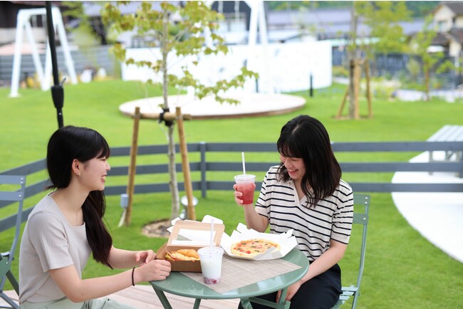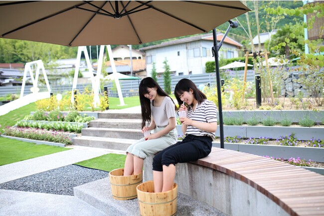 農園カフェ湯郷に隣接する「湯の華ガーデン」は2022年5月14日にオープンしました。花が咲き誇り、青々とした芝生の絨毯が広がるガーデンで、カフェで注文した軽食やスイーツを楽しんでいただけるおしゃピクスポットです。また、足湯エリアも設けられ、美人の湯と言われる湯郷温泉を気軽に堪能していただけます。足湯には季節の花を浮かべることができ、他にはない足湯を楽しんでいただけます。広々としたガーデン内でゆっくり自然と触れ合いながらリラックスできる施設です。