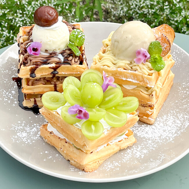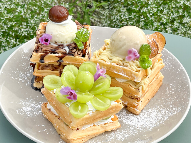 「秋の味覚狩りプレート」は、秋の味覚であるシャインマスカット、栗、さつまいもを使用した贅沢すぎるワッフルプレート。秋の味覚を存分に味わっていただけます。