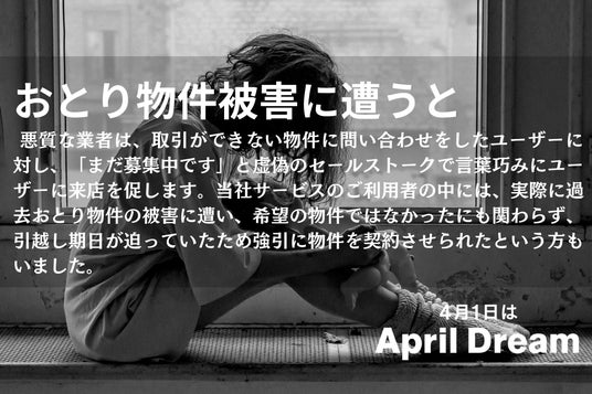 当社サービスのご利用者の中には、実際に過去おとり物件の被害に遭い、希望の物件ではなかったにも関わらず、引越し期日が迫っていたため強引に物件を契約させられたという方もいました。