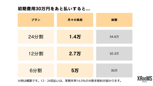 賃貸物件の契約時にかかる敷金・礼金・前家賃などの初期費用を最大24回までの分割払いが可能です。XROOMS Pro(エックスルームスプロ)」を通じて賃貸物件をご成約されたお客様は、敷金礼金といった初期にかかる費用のお支払い方法として、通常の一括払いのほか、分割手数料なしの「6回払い」から「12回払い・24回払い」をご自身のライフスタイルに合わせて自由にお選びいただけます。