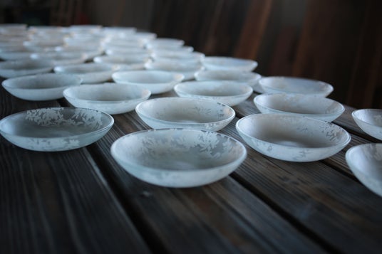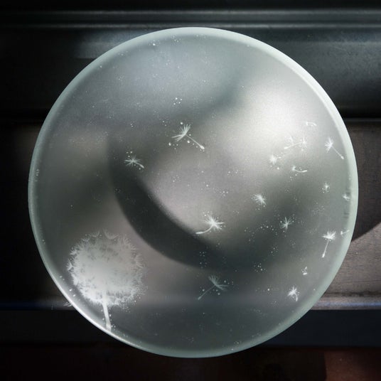 透明なガラス皿にたんぽぽの綿毛がモチーフ