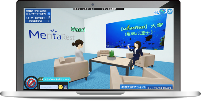 当社は、企業向けに従業員のメンタル不調予防を目的とし、メタバース空間におけるアバターカウンセリングサービス「MentaRest」を提供しています。健康経営やウェルビーイングの観点から、従業員のメンタル不調予防・休職や離職率低下・パフォーマンス向上の施策に注力する企業から注目を集めています。