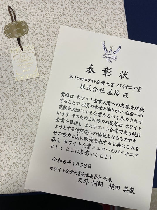 表彰状 『第10回 ホワイト企業大賞 パイオニア賞』令和6年(2024年)1月28日 株式会社 基陽