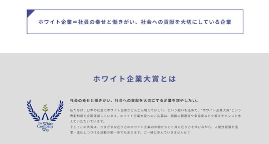 そしてこの大賞は、さまざまな在り方のホワイト企業の仲間たちと共に在り方を学びながら、人間性経営を追求・進化しつづける活動の第一歩でもあります。 ( 出典 ホワイト企業 HPより ( ホワイト企業大賞事務局 (whitecompany.jp))