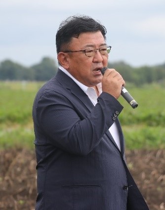 式には、カルビーポテト代表取締役社長 田崎一也(たさき かずや)、帯広市川西農業協同組合 加工馬鈴薯生産組合 組合長 郷原雅道(ごうはら まさみち)様、カルビーポテト川西支所 支所長 岡村廉(おかむら れん)の3名が出席しました。田崎は「2023年も北海道じゃがいもの収穫が最盛期を迎えました。今年も無事にこの時期を迎えられたのも、生産者の皆さまのおかげでございますので改めて感謝申し上げます。」と挨拶した。その上で、「今年は過去数年の中でも一番の収穫量になりそう。生産者さんもいい顔をしておられる。」と語りました。