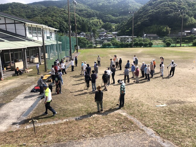 5月21日朝から行われた学習支援センターの生徒と下田南住民の交流グラウンドゴルフの様子