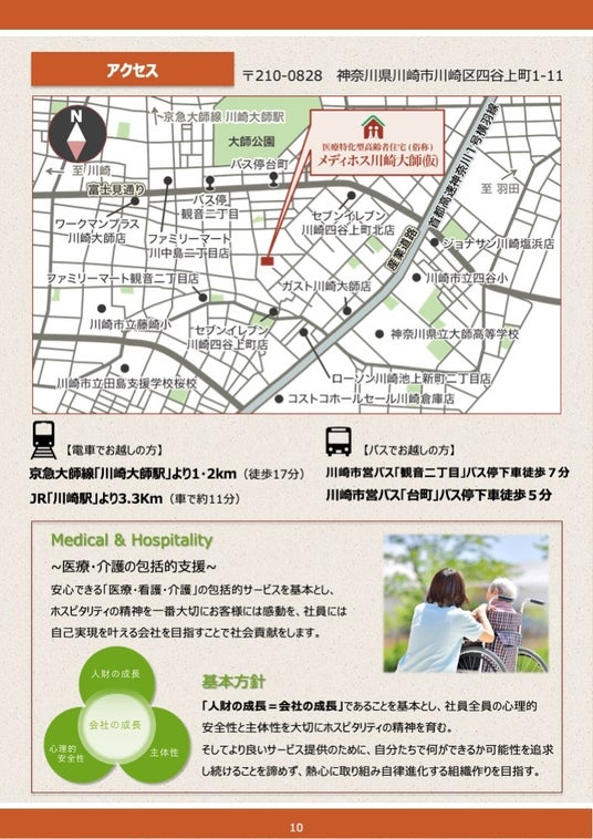 この度「メディホス川崎大師」では弊社他施設同様に、24時間連携での専門医療ケアや介護サービスを必要に応じて提供すると共に、日々の何気ない言葉や様子からご利用者様の「~したい」を積極的に叶えられるように努めてまいります。それにより、ご家族の心理的・肉体的負担が軽減できればと考えています。