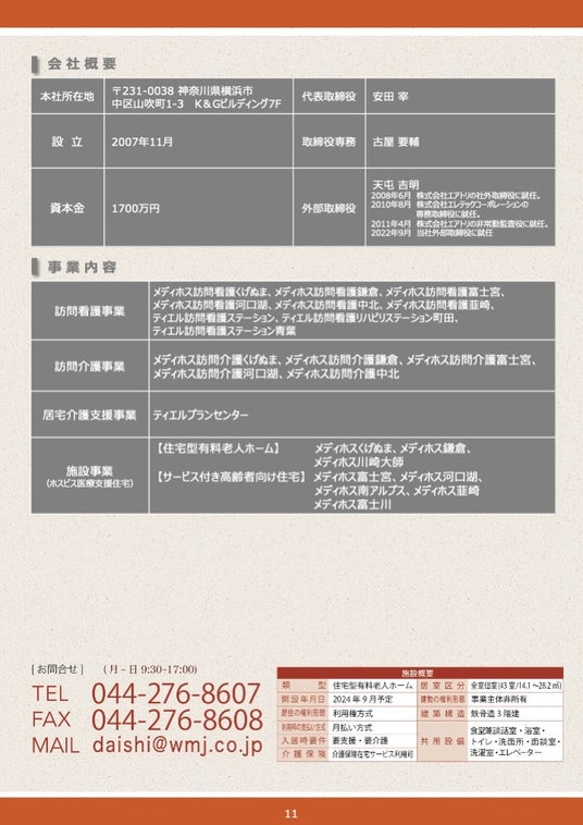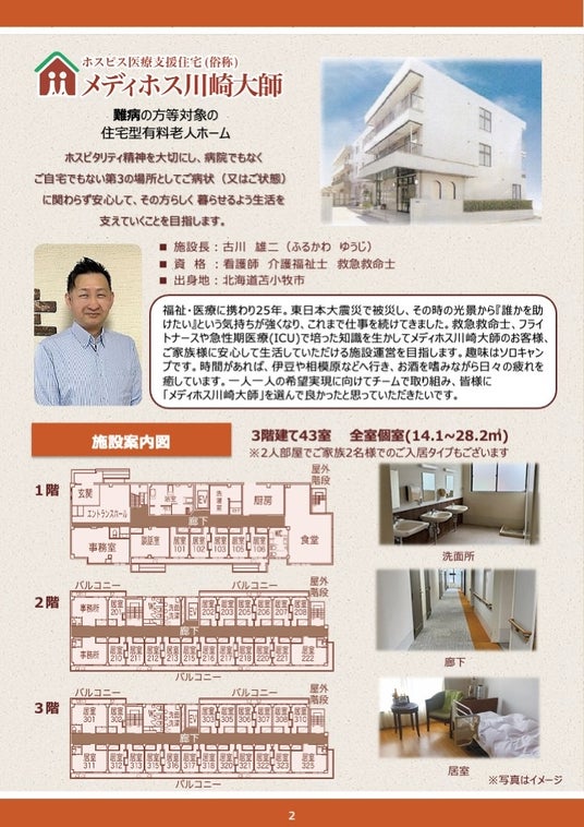 東京、神奈川、静岡、山梨にて施設事業、訪問看護事業、訪問介護事業を展開している株式会社メディホスは、この度、2024年9月1日(日)より、神奈川県川崎市川崎区に難病・がん末期に対応したホスピス医療支援住宅(俗称) 「メディホス川崎大師」(住宅型有料老人ホーム申請中)を開設いたします。