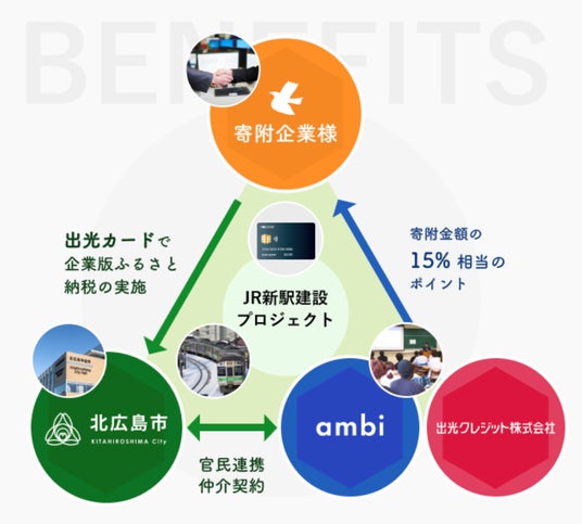 この度Ambiと北広島市が官民連携で実施する、「JR新駅建設プロジェクト」における企業版ふるさと納税の公募に対し、Ambiと出光クレジットが特別プログラムの提供をスタートいたします。出光クレジットの法人カードを持つ法人を対象に、法人カードで本プロジェクトへ寄附を行った場合、寄附金額の15%相当にあたるポイント付与を行います。