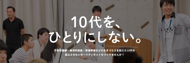 不登校・中退・家庭内不和・経済的困難・いじめ・虐待・進路未定・無業などによって、いくつかの安心できる場や所属先を失ったときに起こる、「10代の孤立」という社会問題を解消するために活動している認定NPO法人。