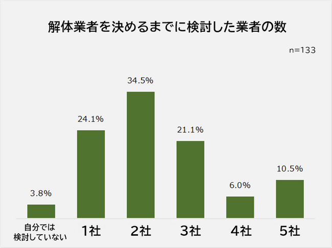 家の解体業者を決めるまでに検討した業者数の平均は2.3社。ボリュームゾーンは「2社(34.5%)」で、2社程度比較する人が多いとわかりました。