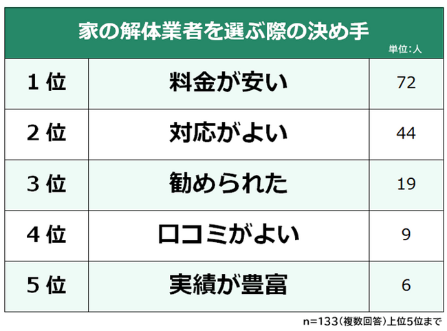 最後に「家の解体業者を選ぶ際の決め手」を聞いたところ、1位は「料金が安い(72人)」でした。過半数の人が、料金で解体業者を選んでいるとわかります。