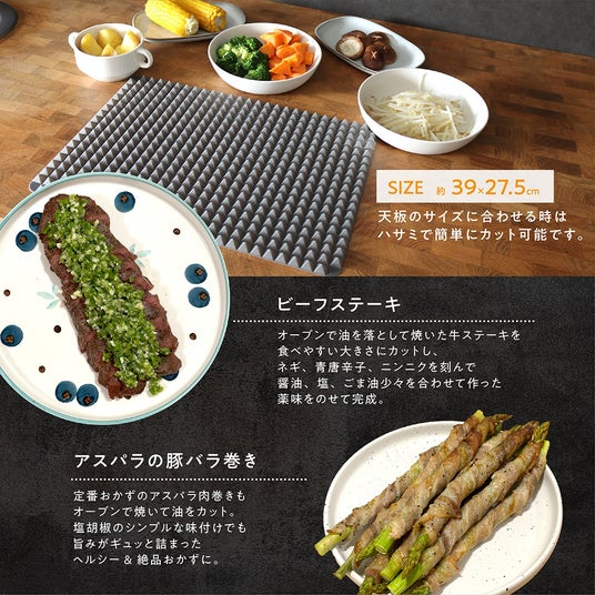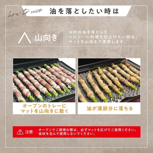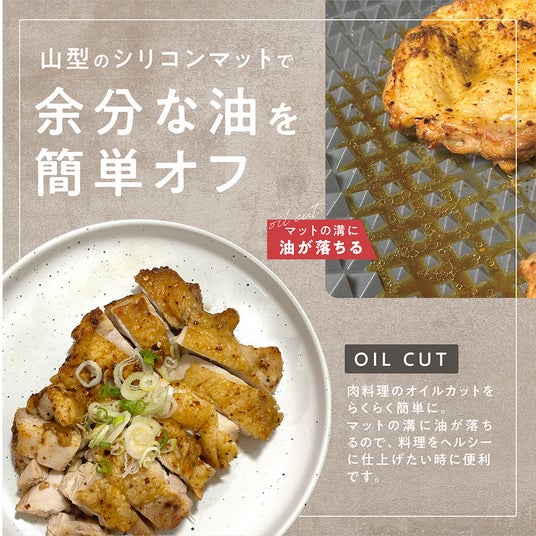 肉料理の際にマットをオーブントレーに敷けば、余分な油が溝に落ちてオイルカットが可能。