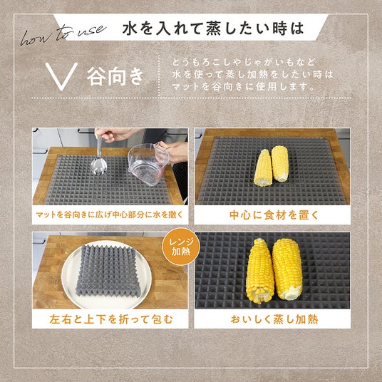 マットに水を撒いてから包めば蒸し加熱も可能です。