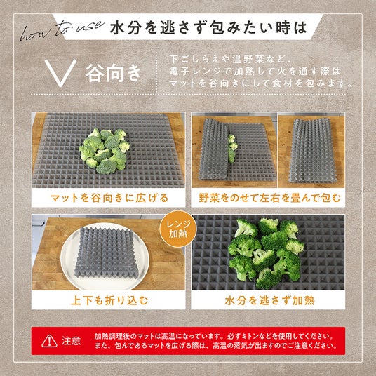また、マットで野菜を包んで加熱すれば、野菜の下ごしらえが簡単に。