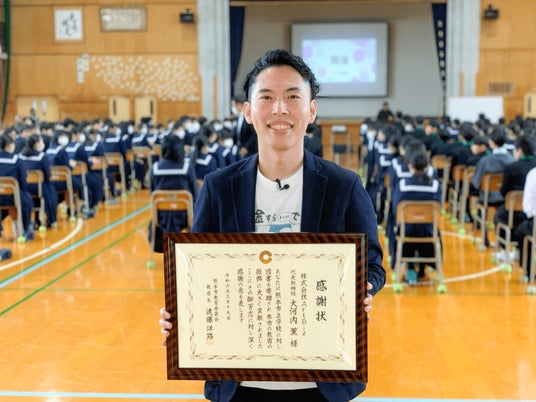 寄贈式にて熊本市教育委員会からの感謝状を受け取る、(株)ArtBiz代表 大河内薫