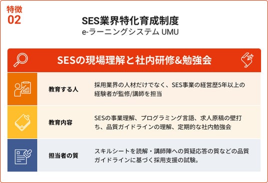 実践的な教育体制元SES事業5年以上の経営者、人事経験者が社内研修の顧問・講師を担当。採用の知見とSES事業の知見を併せ持つ講師が、直接社内育成を実施します。チーム全員が業界特有の課題や実情を深く理解しており、「SES業界特有の課題を説明しなくても、話が早くて助かる」と多くの企業様に評価いただいております。