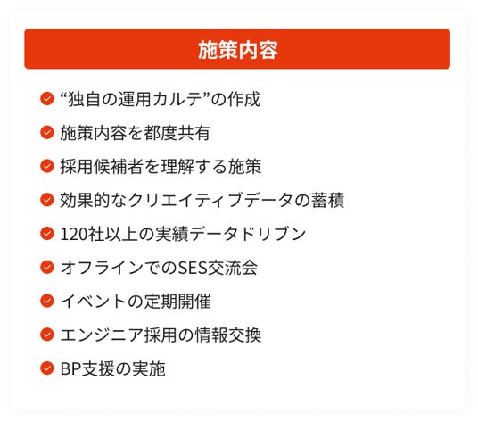 求人広告とスカウトを組み合わせた二軸の採用戦略を構築し、メッセージ内容や配信時間を最適化。 加えて、面談フローを見直し、スキルだけでなく候補者の価値観や志向性を重視する選考プロセスへと改善しました。