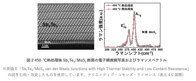 一般的に、集積回路の配線工程では400 ℃以上の耐熱性が実用化の重要な要件となります。そこで、Sb2Te3/MoS2積層膜構造の耐熱性を調べました。熱処理前後に、MoS2単層構造を維持していることを、ラマン分光法を用いた分析により確認しました。また、断面TEM写真(図2)より、Sb2Te3/MoS2積層膜構造は450 ℃の熱処理を経ても良好な結晶性とファンデルワールス界面を維持していることを明らかにしました。