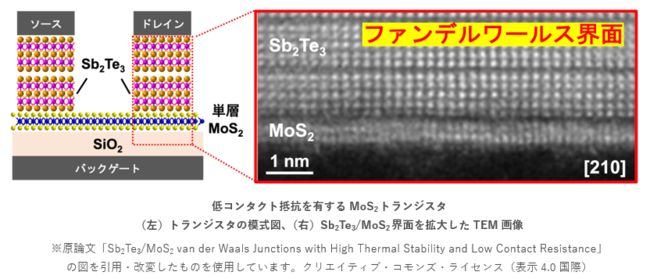 国立研究開発法人 産業技術総合研究所(以下「産総研」という)デバイス技術研究部門 張 文馨(Chang Wen Hsin) 主任研究員、畑山 祥吾 産総研特別研究員、齊藤 雄太 研究グループ付、岡田 直也 主任研究員、入沢 寿史 研究グループ付らは、東京都立大学 宮田 耕充 准教授と共同で三テルル化二アンチモン(Sb2Te3)/二硫化モリブデン(MoS2)のファンデルワールス界面の作製に成功し、n型MoS2トランジスタ性能向上に大きく貢献する接触界面抵抗の低減(低コンタクト抵抗)技術を開発しました。