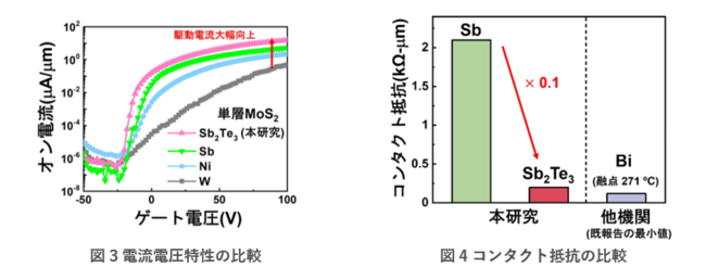 Sb2Te3/MoS2ファンデルワールス界面形成がトランジスタ特性にどのような影響を与えるかを調べました。図3にMoS2トランジスタの電流電圧特性の比較を示します。n型トランジスタ動作を示しつつ、Sbや、Ni、Wをコンタクト材料として使用した場合と比べて、Sb2Te3電極を有するトランジスタの駆動電流は4~30倍にも向上することがわかりました。このような大幅な駆動電流の増大はコンタクト抵抗の低減が主要因であると考え、実際にMoS2トランジスタのコンタクト抵抗を求めた結果を図4に示します。Sb2Te3電極を有するトランジスタのコンタクト抵抗値は、Sb電極を使用した場合のそれと比べて1桁程度低く、また、これまでの世界最小の報告であるBi電極を使用した場合のコンタクト抵抗値とも遜色のない値であることがわかりました。SbやBi電極は半導体製造の後工程の高温に耐えないため、半導体デバイスへの使用には適しません。Sb2Te3電極は400 ℃以上の耐熱性を示しつつ、Bi電極に匹敵する低いコンタクト抵抗値を実現しており、これを両立したという報告は世界でも本研究が初となります。
