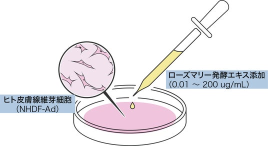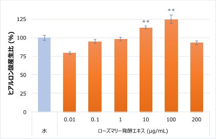 200 μg/mLまでを適切な濃度範囲としてローズマリー発酵エキスを使用し、ヒト皮膚線維芽細胞(NHDF-Ad)へのサンプル添加によってコラーゲンとヒアルロン酸の産生量への影響を測定した。