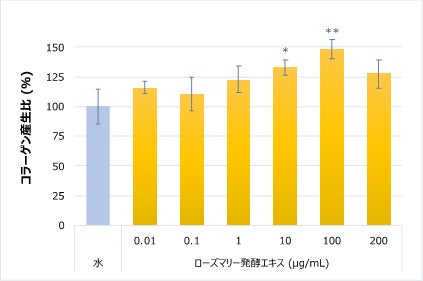 1.コラーゲン産生試験(抗シワ効果試験): 試験の結果、各濃度のローズマリー発酵エキスで処理したヒト皮膚線維芽細胞のコントロールに対するコラーゲン産生の比率のデータから見ると、コラーゲンの産生量がローズマリー発酵エキスサンプルの濃度とともに増加する傾向を示した。10および100 μg/mLの濃度で有意差を示し、特に100 μg/mLの濃度での効果が最大になった。