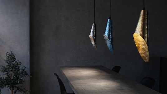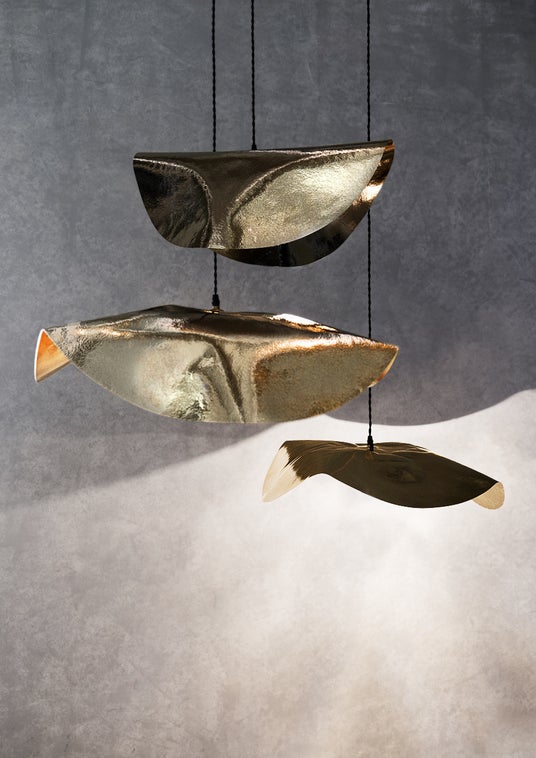 チタンという金属の可能性を探求し続け、偶然の中に生まれる必然性という概念をプロダクトの中に落とし込んだ照明は、オブジェのような存在感と眩い光で空間を華やかに照らし出します。