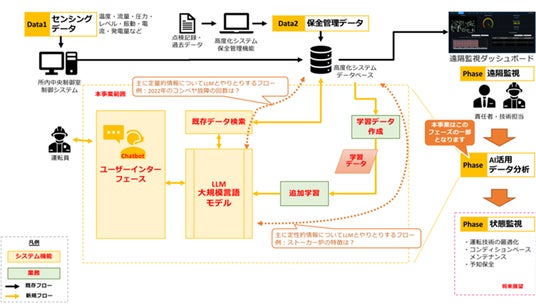 本機能は、「BMecomo」に蓄積したデータや過去のトラブルシューティングと大規模言語モデル(LLM)を組み合わせることで、上記の課題克服を支援する次のようなシステム構成・実施プロセスとなっています。