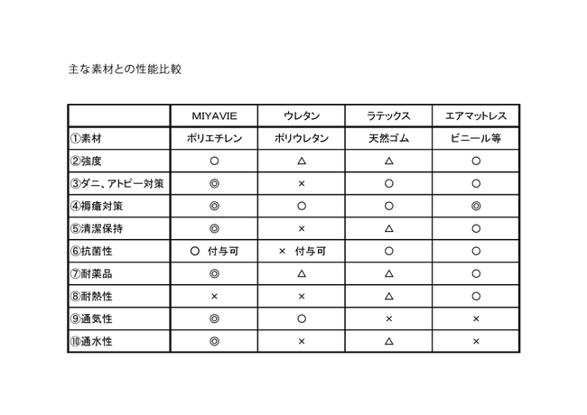 体圧分散効果においては、他のウレタン・スポンジ類のクッション・マットレス素材と比較し、最も優れた性能を実現し、加えて、3倍の効果の持続性・耐久性があります。