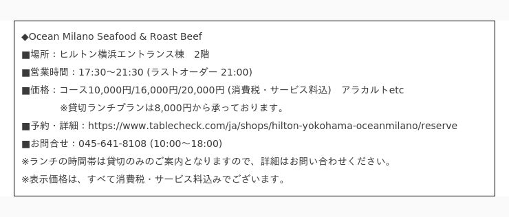 ご予約はこちら〈https://www.tablecheck.com/ja/shops/hilton-yokohama-oceanmilano/reserve〉