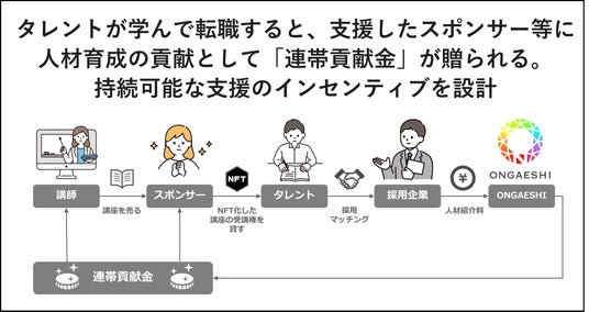 ONGAESHIは、「学びのスポンサー」が購入した「学ぶ権利(受講権)」をタレントに貸すことで、無償の学びと転職を支援する仕組みです。タレントが学んで転職すると、学びのスポンサーや講座提供者などに、人材育成の貢献の返礼として連帯貢献金(※2)が贈られます。さらに、タレントの学習進捗に応じて、最大500 ONGAESHIコイン(※3)がタレントとスポンサーそれぞれに付与されます。(Learn to earn機能)