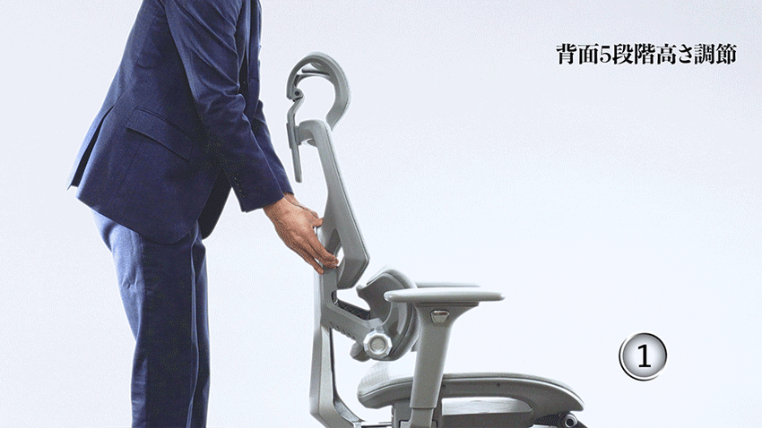 背面は5段階高さ調節可能、体格に合わせて背面の高さを変更することにより、お好みの位置に3ゾーンランバーサポートを調節できます。