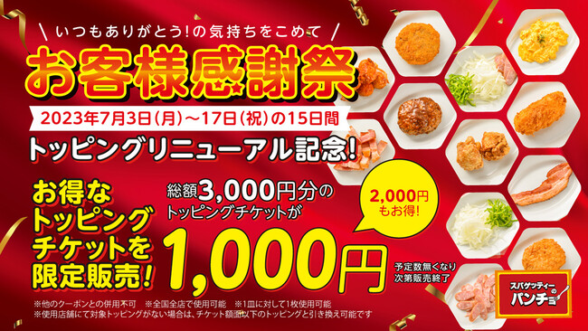 『スパゲッティーのパンチョ』『キッチンパンチョ』を全国で展開する株式会社パンチョは、2023年7月3日(月)から7月17日(月)の15日間、トッピングメニューのリニューアルを記念しお客様感謝祭を開催します。ナポリタンの楽しみ方として豊富なトッピングをさらに充実させる今回、新トッピングも気軽にお試しいただけるよう、通常よりも総額2000円分OFFで12種のトッピングに使える「トッピングチケット」をお客様感謝祭の期間中に販売します。トッピングチケットには人気トッピング「厚切りベーコン」や「から揚げ」「ハンバーグ」など、どれも満足いただける12種をラインナップ。トッピングチケットは10月末まで使えますので、この機会にぜひパンチョのリニューアルしたトッピングをお楽しみください。